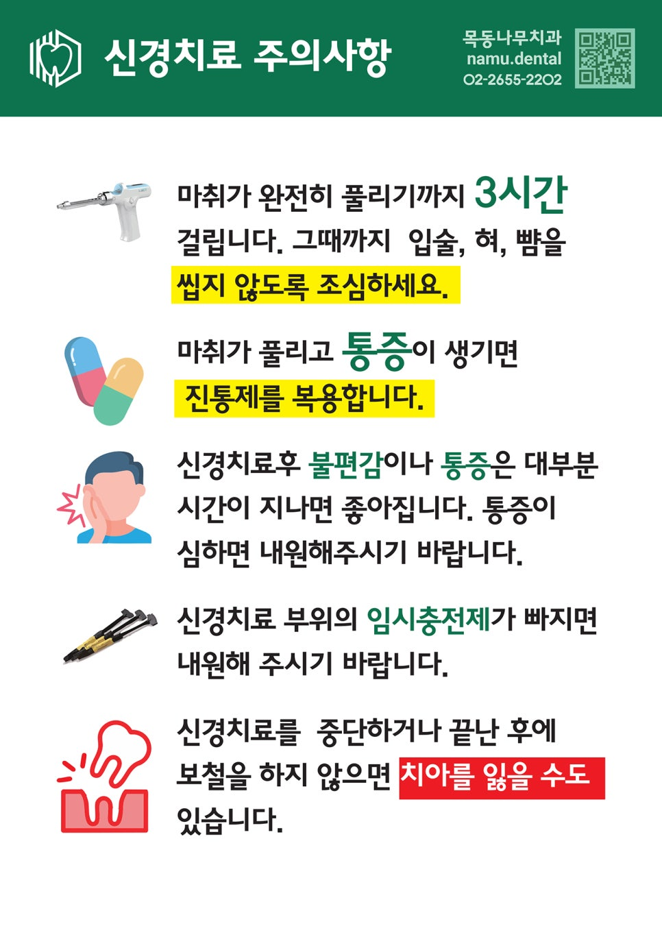 신경치료 후에 주의사항은 다음과 같습니다.
